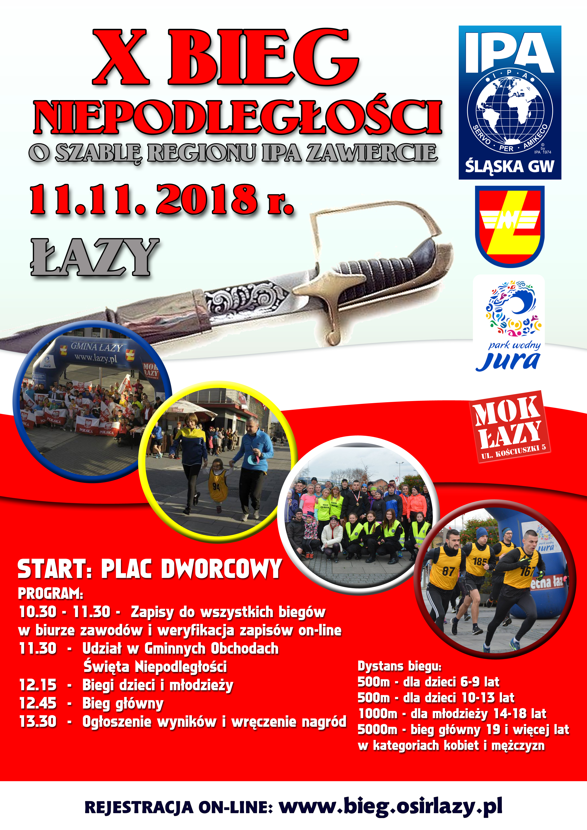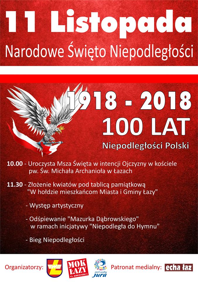 Obchody rozpocznie uroczysta Msza święta odprawiona w kościele pw. Św. Michała Archanioła w Łazach. Następnie zebrani złożą kwiaty pod pamiątkową tablicą w centrum Łaz. Jak w całej Polsce, w Łazach o 12.00 wszyscy chętni odśpiewają Mazurka Dąbrowskiego w ramach akcji „Niepodległa dla Hymnu”. Następnie, podobnie jak w latach poprzednich, zaplanowano świętowanie na sportowo. 11 Listopada w Łazach to tradycyjnie już Bieg Niepodległości o Szablę Regionu IPA Zawiercie (Międzynarodowego Stowarzyszenia Policji). To już dziesiąta edycja tej imprezy. W zawodach mogą wziąć udział wszyscy, bez względu na wiek – zachęca Adrian Kała, dyrektor Parku Wodnego Jura w Łazach.