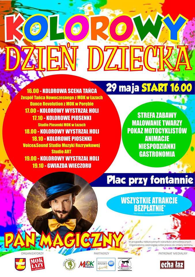 Gmina Łazy i Miejski Ośrodek Kultury zapraszają wszystkich do wspólnego świętowania. Kolorowy Dzień Dziecka! Na uczestników wydarzenia czeka moc atrakcji: animacje dla najmłodszych, dmuchańce, zabawa kolorowym proszkiem Holi, pokazy, występy artystyczne - kolorowa scena tańca i kolorowa scena piosenki, gwiazdą wieczoru będzie PAN MAGICZNY, który zaprezentuje niepowtarzalny pokaz iluzji. Wydarzenie odbędzie się w dniach 29 maja na Placu przy Fontannie w godzinach 16.00 - 20.00. Serdecznie zapraszamy!!!