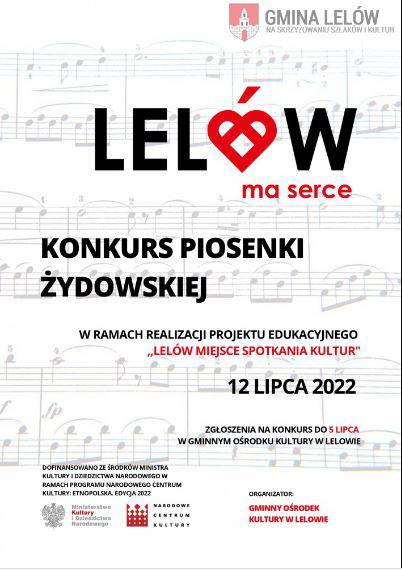 Serdecznie zapraszamy do udziału w Konkursie Piosenki Żydowskiej, które odbędą się w Gminnym Ośrodku Kultury w Lelowie w ramach realizacji projektu edukacyjnego "Lelów miejsce spotkania kultur", który dofinansowano ze środków Ministra Kultury i Dziedzictwa Narodowego w ramach programu Narodowego Centrum Kultury: EtnoPolska. Edycja 2022.