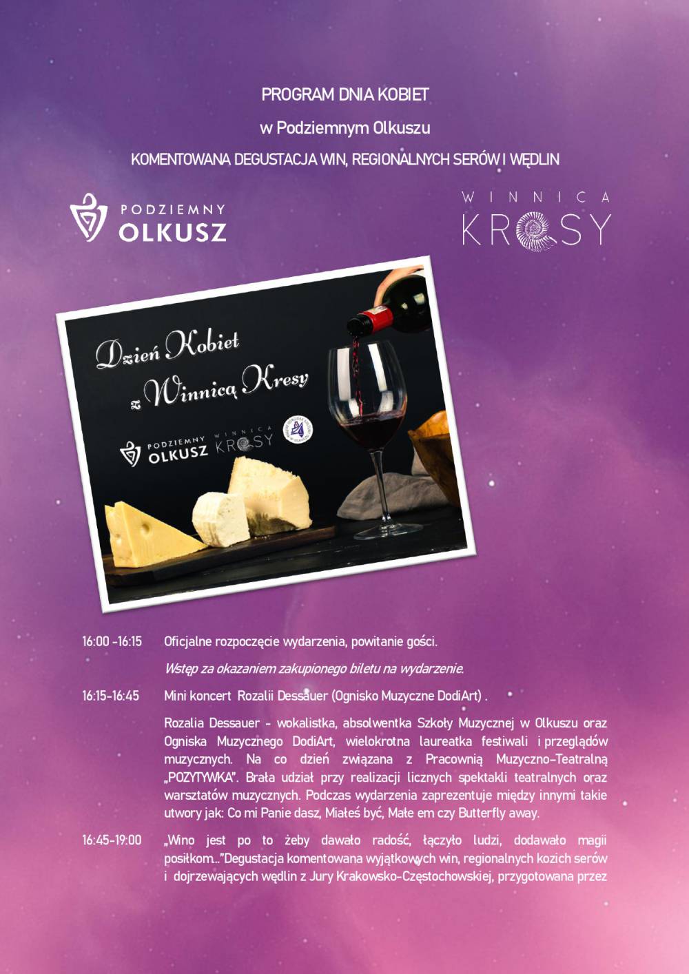 Podziemny Olkusz wraz z “Winnicą KRESY” przygotował mnóstwo atrakcji z okazji Dnia Kobiet. Ten wyjątkowy wieczór od godziny 16:00 rozpocznie degustacja win, regionalnych serów i wędlin wybranych specjalnie dla Pań.