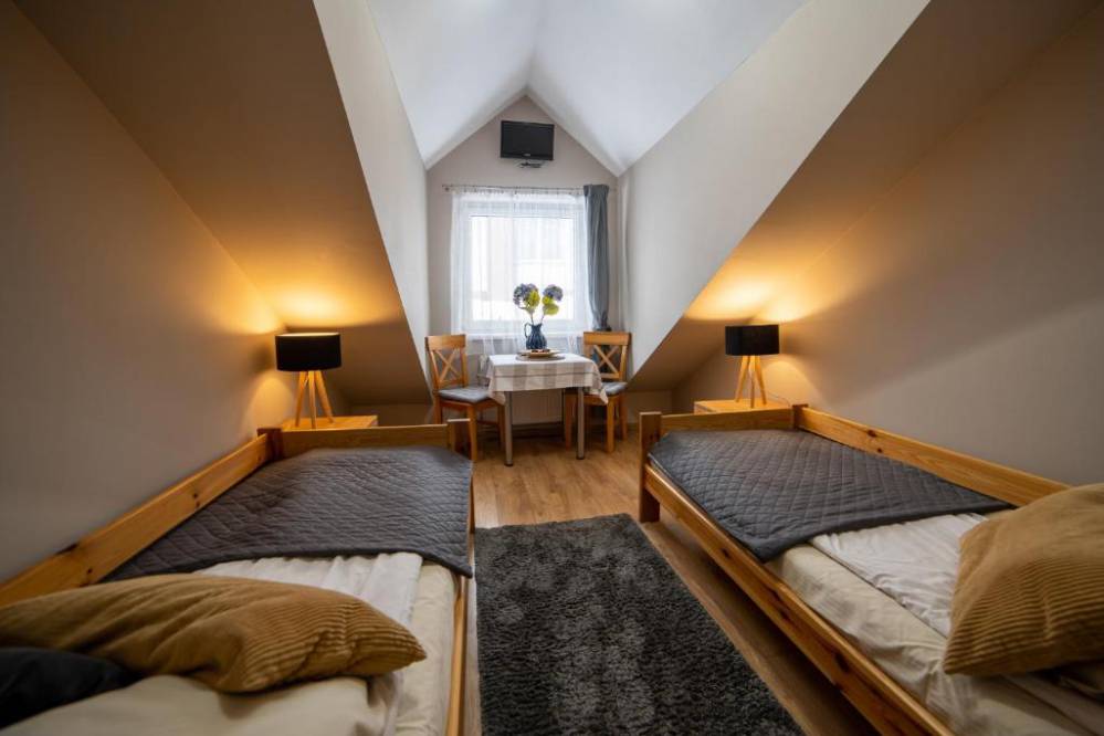 Do dyspozycji naszych Gości oddajemy 36 miejsc noclegowych (z dostawkami) w pokojach urządzonych w ciepłej kolorystyce, wyposażonych w łazienki z pełnym węzłem sanitarnym.