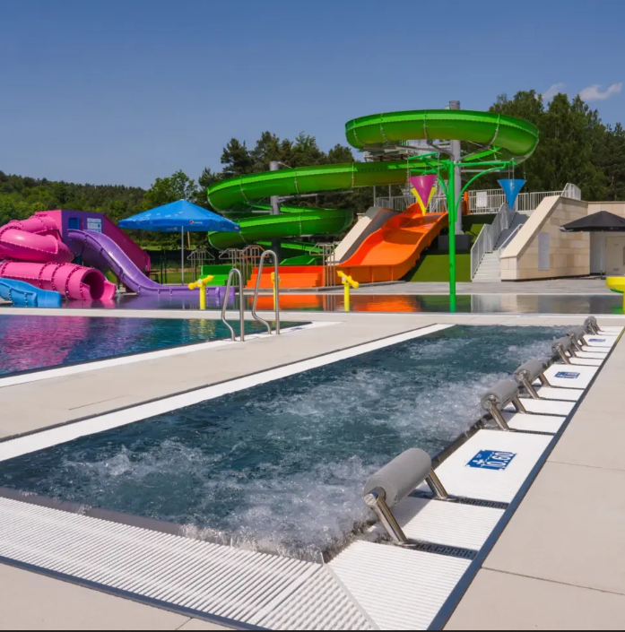 - Dwie duże zjeżdżalnie, rodzinna i pontonowa,