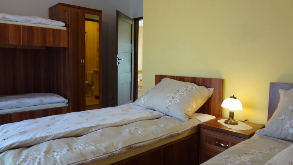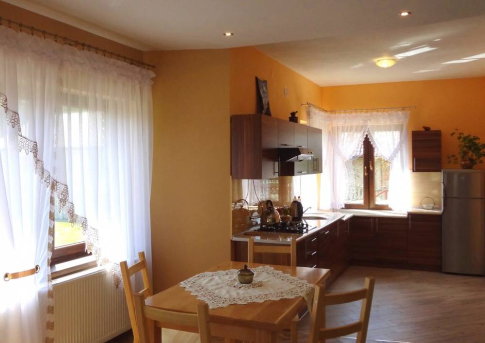 W domu na parterze znajduje się duża kuchnia w pełni wyposażona, w której przygotują Państwo każdy posiłek włącznie z obiadem. Kuchnia połączona jest z przestronną jadalnią, która składa się z dwóch pomieszczeń, w każdym z nich znajduje się duży stół, przy którym wygodnie zasiądzie czteroosobowa rodzina. Z jadalni wychodzimy na taras od strony wschodniej i południowej. Taras od strony południowej osłonięty jest daszkiem, dlatego nawet w bardzo słoneczny dzień, czy deszczową pogodę można zjeść posiłek na świeżym powietrzu-podziwiając piękny widok stawu, obok którego spaceruje bocian. Na parterze mamy jeden z pokoi czteroosobowy idealny dla rodzin z małymi pociechami. Z pokoju tego również wychodzimy na taras od strony wschodniej, którym możemy przejść na taras południowy osłonięty daszkiem. Na poddaszu są jeszcze dwa pokoje trzy osobowy z balkonem od strony zachodniej oraz pokój dwu osobowy również z balkonem. Wszystkie nasze pokoje posiadają łazienki i wyposażone są w wygodne łóżka 90cm, telewizje, Internet, a w pokoju dwuosobowym jest łóżko małżeńskie.