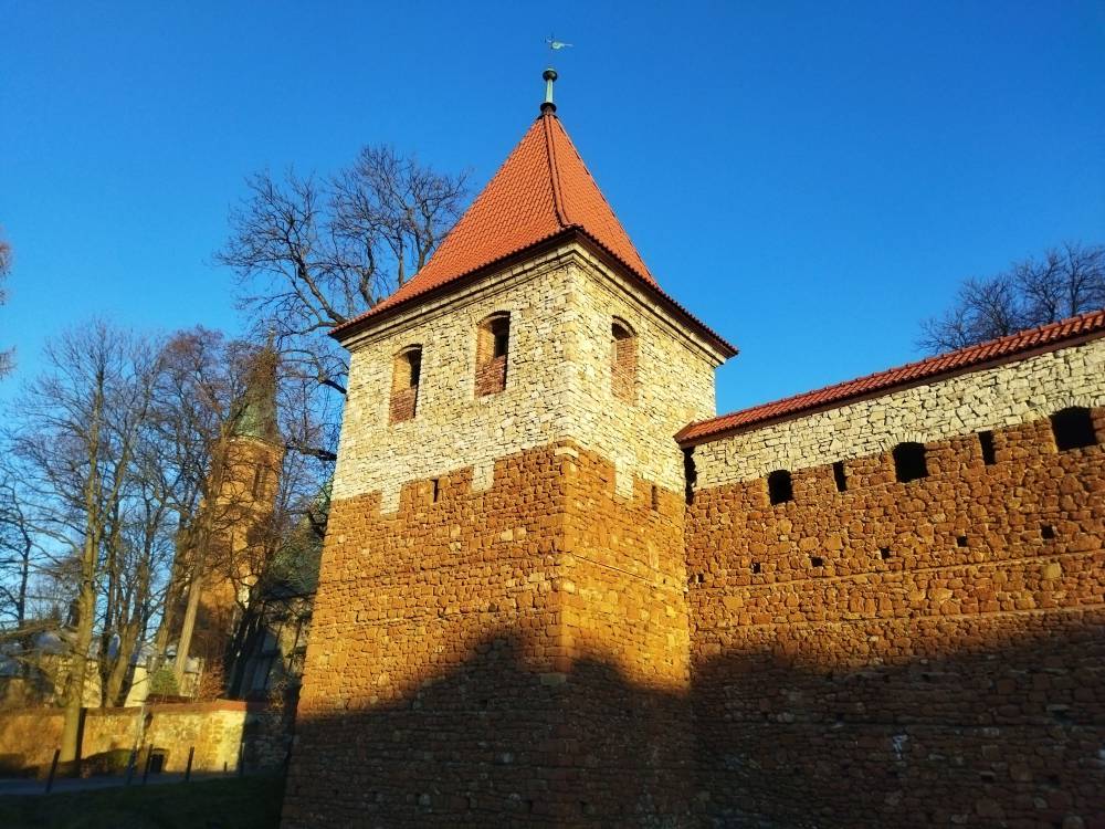 Zrekonstruowany fragment murów obronnych z basztą pokazuje, jak wyglądał w średniowieczu system obronny Olkusza.