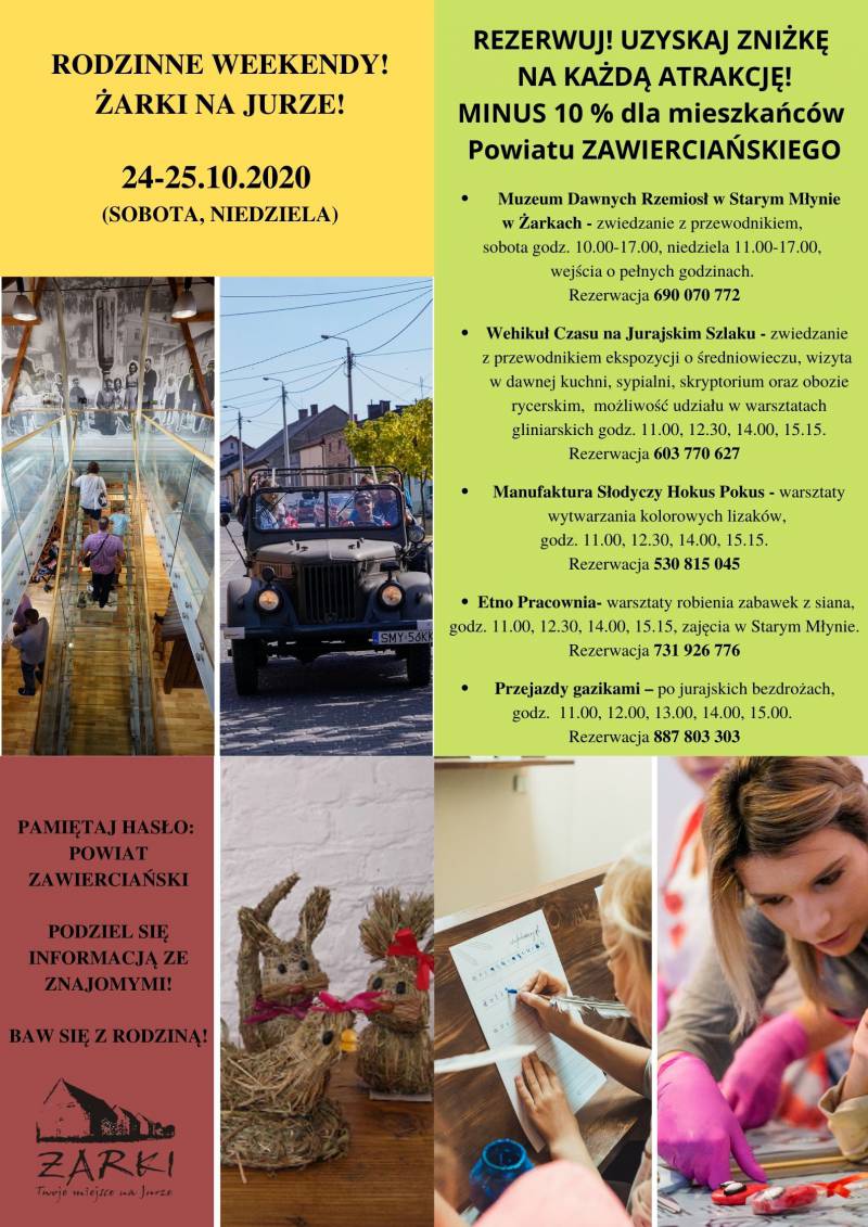 Zapraszamy serdecznie do skorzystania z weekendu z atrakcjami w terminie 24-25.10.2020 (sobota, niedziela) dla gości indywidualnych w Żarkach na Jurze. REZERWUJ! UZYSKAJ ZNIŻKĘ NA KAŻDĄ ATRAKCJĘ. MINUS 10 proc. dla mieszkańców Powiatu Zawierciańskiego.