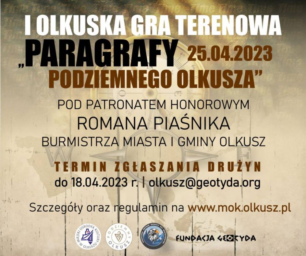 Zapraszamy do udziału w I Olkuskiej Grze Terenowej “Paragrafy Podziemnego Olkusza” organizowanej pod patronatem honorowym Romana Piaśnika – Burmistrza Miasta i Gminy Olkusz.