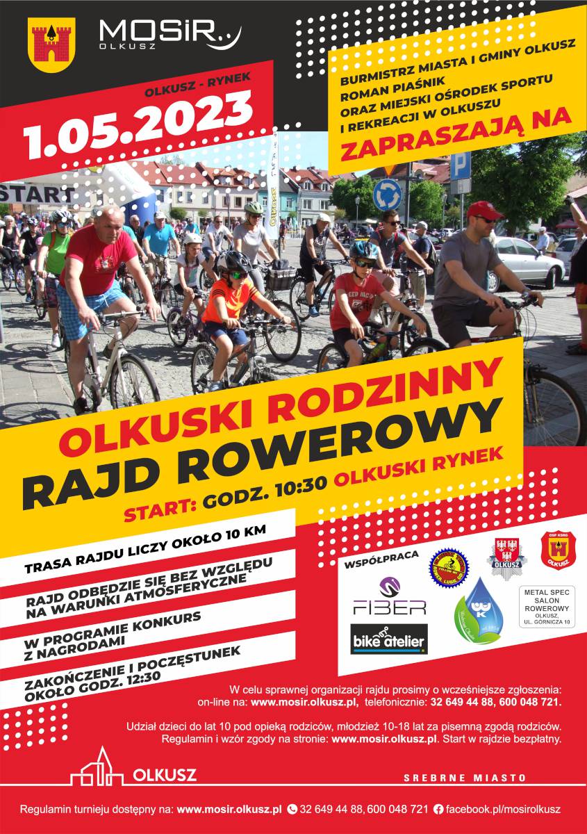 W poniedziałek 1 maja, a więc na rozpoczęcie przedłużonego majowego weekendu, o godz. 10:30 Miejski Ośrodek Sportu i Rekreacji w Olkuszu zaprasza na Olkuski Rodzinny Rajd Rowerowy. Uczestnicy spotkają się na płycie olkuskiego Rynku, skąd ulicami miasta pokonają tegoroczną trasę liczącą 10 kilometrów. Będzie to pierwszy typowo uliczny rajd, podczas którego o bezpieczeństwo uczestników zadbają służby mundurowe.