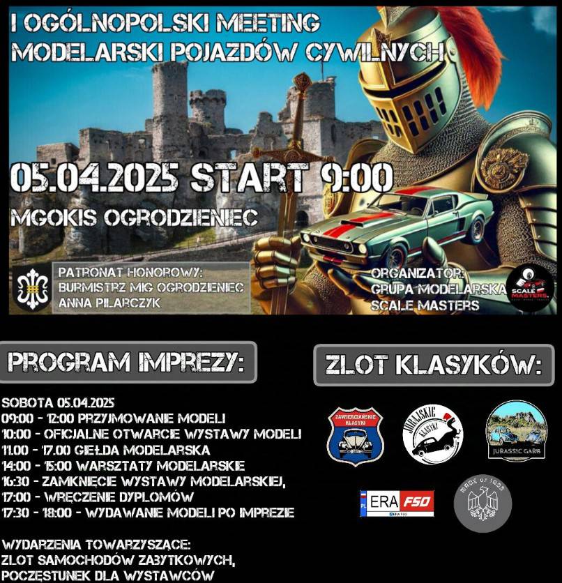Mateusz Plutka oraz Grupa Modelarska Scale Masters, pod honorowym patronatem Burmistrz Miasta i Gminy Ogrodzieniec Pani Anny Pilarczyk, zapraszają na wyjątkowe wydarzenie dla miłośników modelarstwa i motoryzacji. 5 kwietnia 2025 r. w Miejsko-Gminnym Ośrodku Kultury i Sportu w Ogrodzieńcu odbędzie się I Ogólnopolski Meeting Modelarski Pojazdów Cywilnych, połączony z Zlotem Pojazdów Zabytkowych.