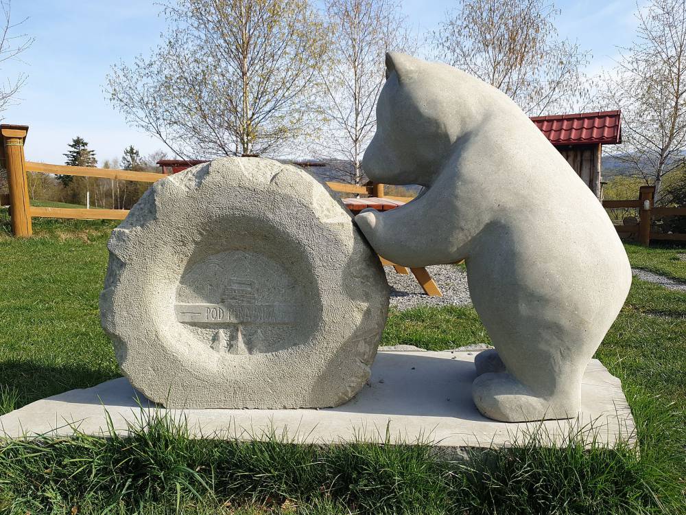 Niedźwiadek stoi na zboczu góry Kamienny (791 m n.p.m.) próbuje przetoczyć ogromne koło samochodowe i tym samym nawiązuje do toru offroadowego, obok którego został postawiony. Na rozległych terenach Moto Parku Pod Piramidą oprócz toru offroadowego odwiedzający mogą skorzystać z pola paintballowego, strzelnicy, punktu gastronomicznego, tarasu widokowego i placu zabaw dla dzieci. Atrakcją są organizowane tutaj nocne obserwacje nieba.