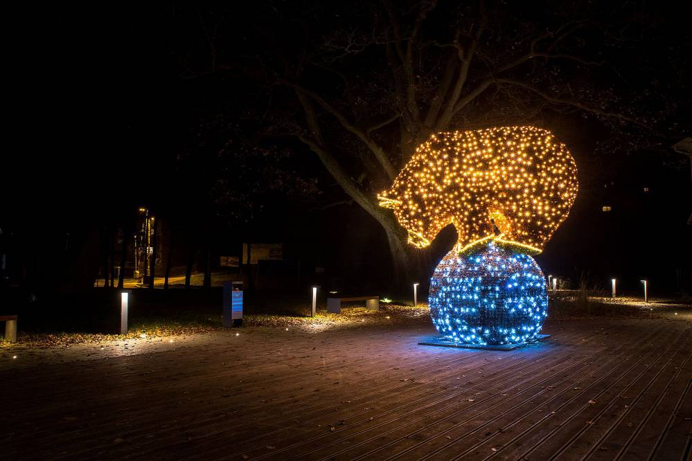 Kamienny miś na kuli powstał w 2017 r. i jest wiernym odwzorowaniem figury zlokalizowanej w Parku im. St. Kopczyńskiego. Rzeźba znajduje się w odległości zaledwie 280 m od wiślańskiego rynku - Placu Bogumiła Hoffa.