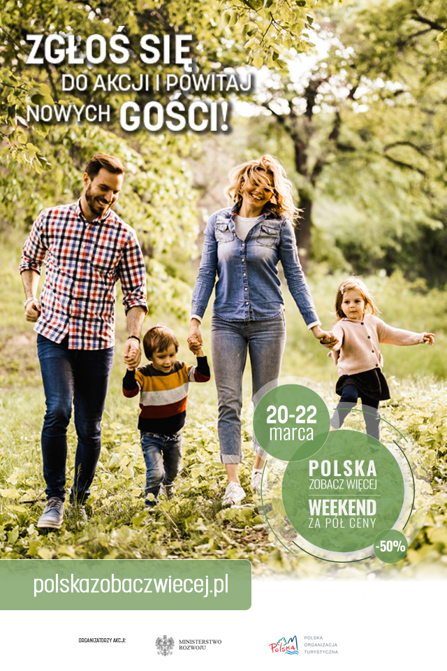 Trwa nabór zgłoszeń do ósmej edycji akcji POLSKA ZOBACZ WIĘCEJ – WEEKEND ZA PÓŁ CENY. Zgłoszenia przyjmuje Polska Organizacja Turystyczna do końca stycznia 2020! W tej edycji promocja akcji realizowana będzie na rynku krajowym oraz 10 zagranicznych (Niemcy, Czechy, Słowacja, Ukraina, Białoruś, Litwa, Rosja, Finlandia, Szwecja, Norwegia. To doskonała okazja do promowania najpiękniejszych zakątków naszego regionu! Zachęcamy do udziału!