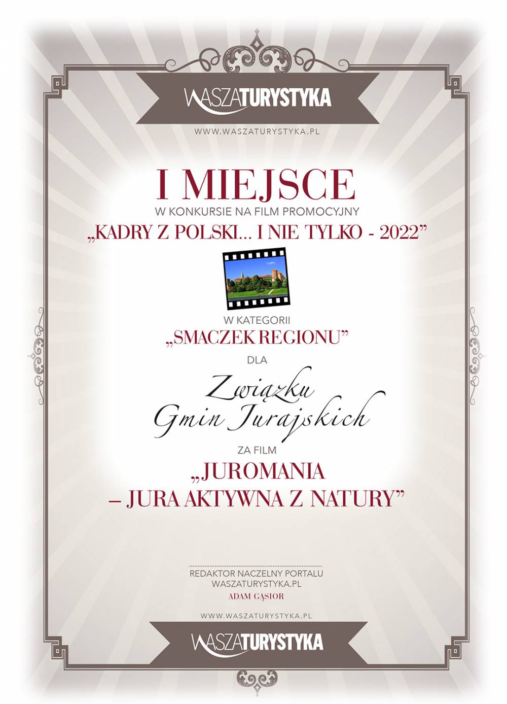 Mianowicie w ostatnich dniach dotarła do nas informacja, że film zgłoszony przez Związek Gmin Jurajskich w konkursie „Kadry z Polski... I nie tylko – 2022”, który został nakręcony w czasie trwania zeszłorocznej edycji największego jurajskiego festiwalu, czyli Juromania, został nagrodzony!